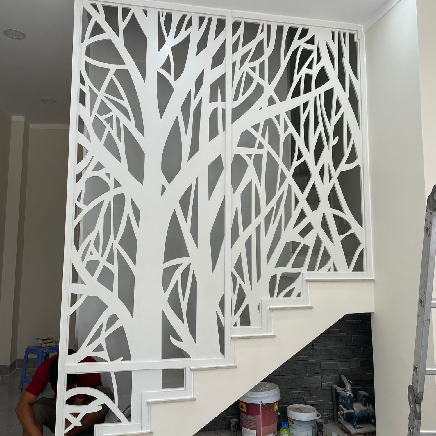 Ngoài ra, vách ngăn cầu thang còn được sử dụng công nghệ cắt CNC tiên tiến