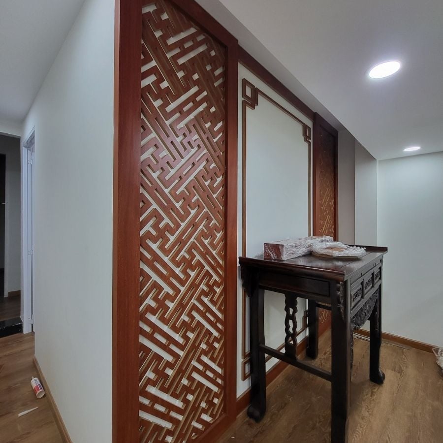 Vách ngăn bàn thờ chung cư giúp tạo không gian riêng tư, trang nghiêm cho khu vực thờ cúng. Vách ngăn hoa sen bản to độc đáo mang lại vẻ đẹp thẩm mỹ cho căn hộ và che chắn bàn thờ khỏi bụi bẩn.